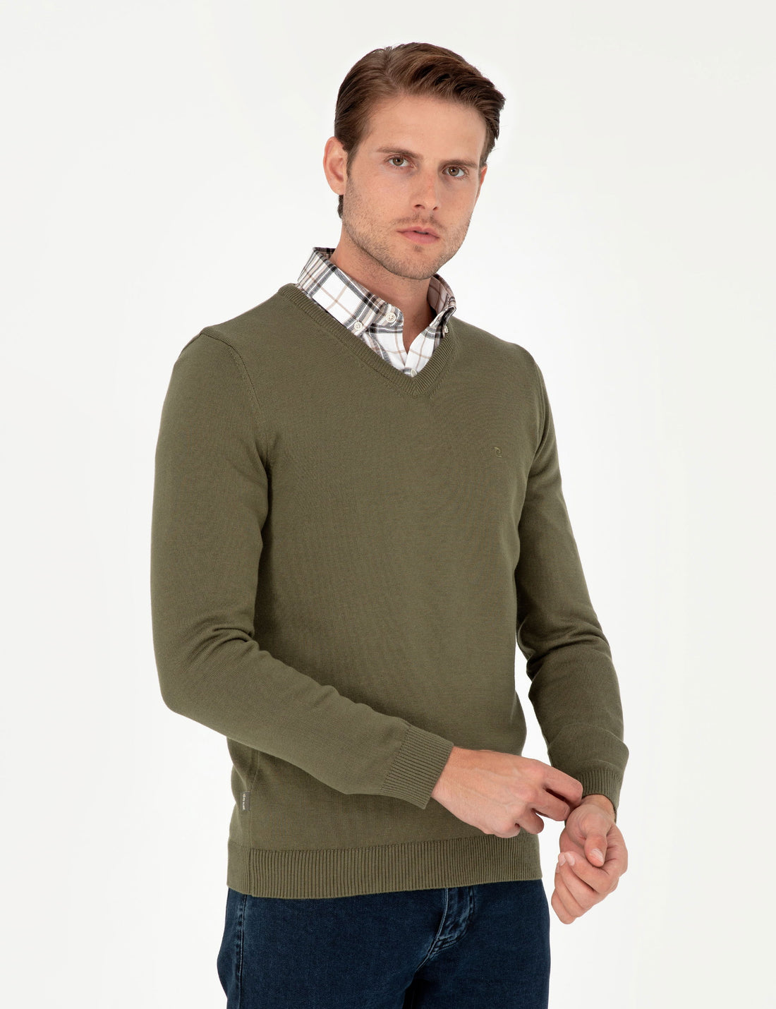 Dark Khaki Slim Fit V Neck Basic Knitwear Sweater